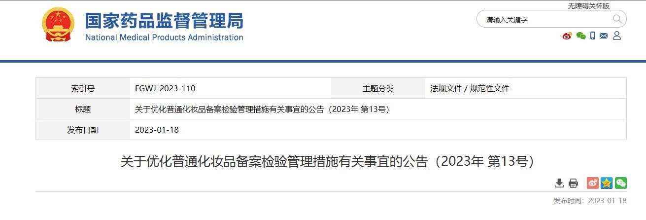 关于优化普通化妆品备案检验管理措施有关事宜的公告(2023年 第13号)