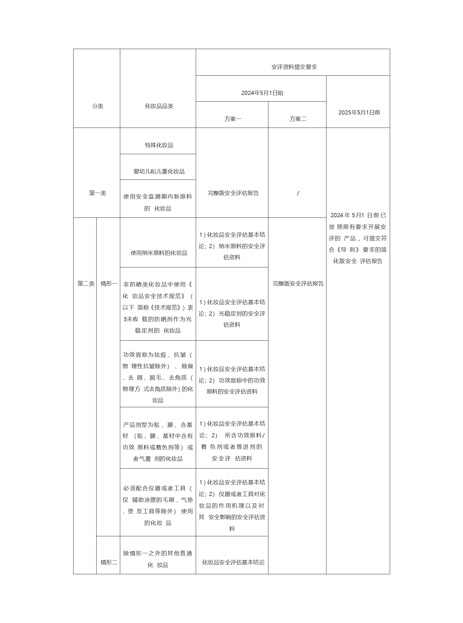 答:根据《化妆品安全评估资料提交指南》中关于化妆品分类规定:参照《分类规则》,在化妆品的功效宣称、使用人群、产品剂型等不同维度分类的基础上,综合考虑不同类型的风险程度,增加是否使用监测期内新原料或纳米原料等较高风险的原料、是否必须配合仪器或者工具使用等分类维度,并结合化妆品安全评估资料中重点关注的内容,将化妆品分为两类。化妆品安全评估资料根据两大分类两种情形选择提交相应资料,第一类化妆品需提交化妆品安全评估报告,第二类化妆品在完成化妆品安全评估报告和备案人质量管理体系运行良好前提下,情形一化妆品可提交化妆品安全评估基本结论和下表对应的不同风险点的安全评估资料,情形二化妆品可提交化妆品安全评估基本结论。第二类化妆品也可选择直接提交化妆品安全评估报告。