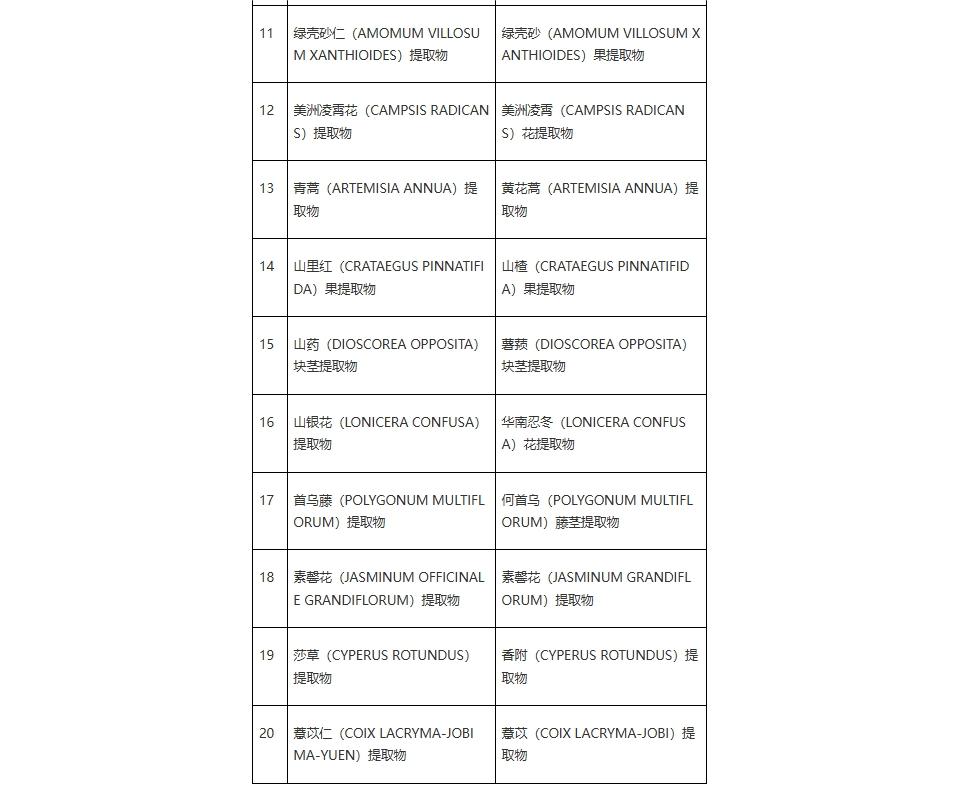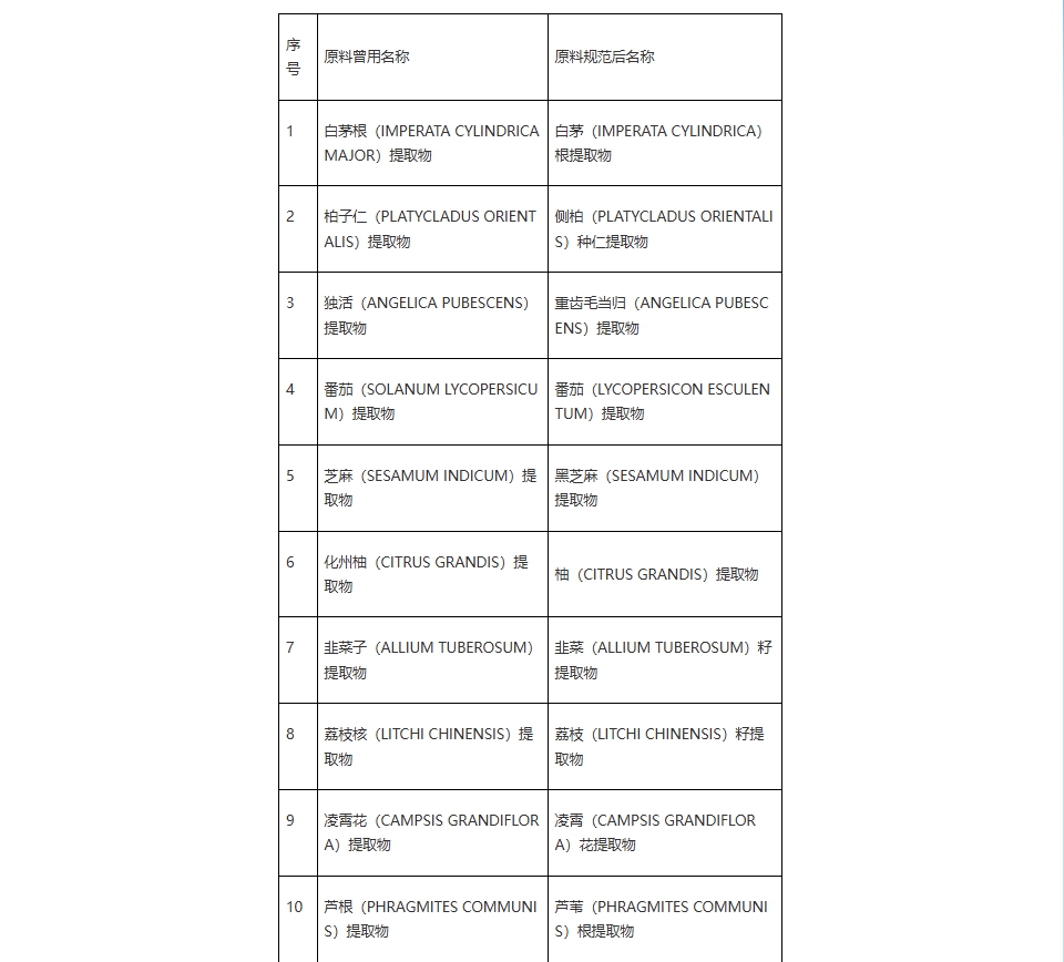 答:《已使用化妆品原料目录》(2015版)中存在同一原料有多个中文名称的情况,《已使用化妆品原料目录》(2021版)将同一原料的名称进行了规范统一,具体清单见下表。自2021年5月1日起,备案人进行化妆品备案的,应当使用《已使用化妆品原料目录》(2021版)规范后的原料名称。