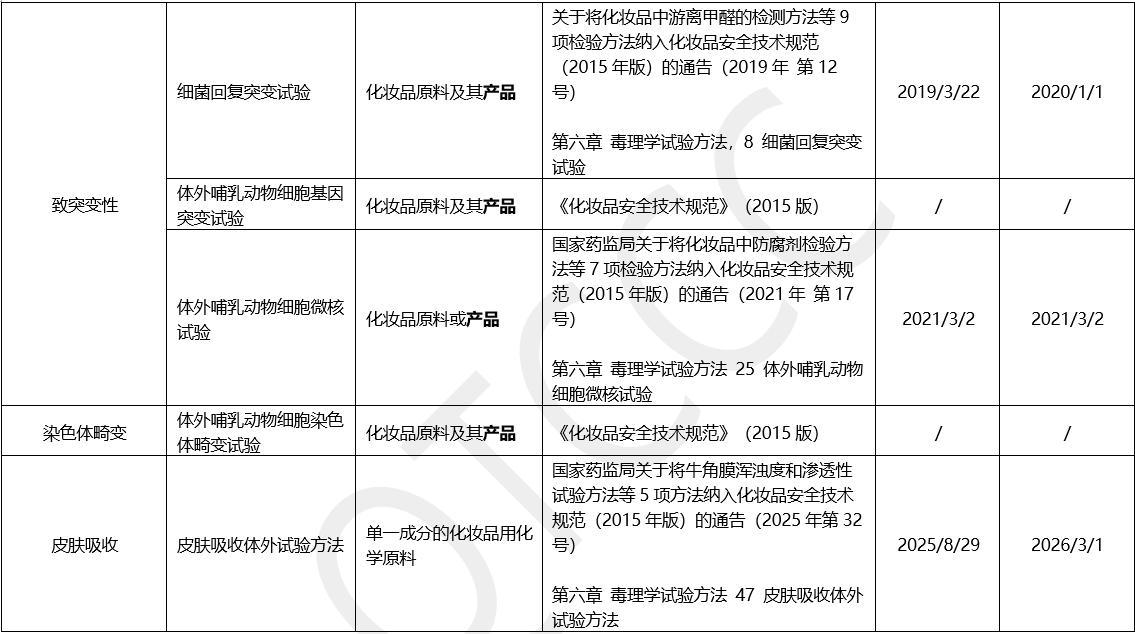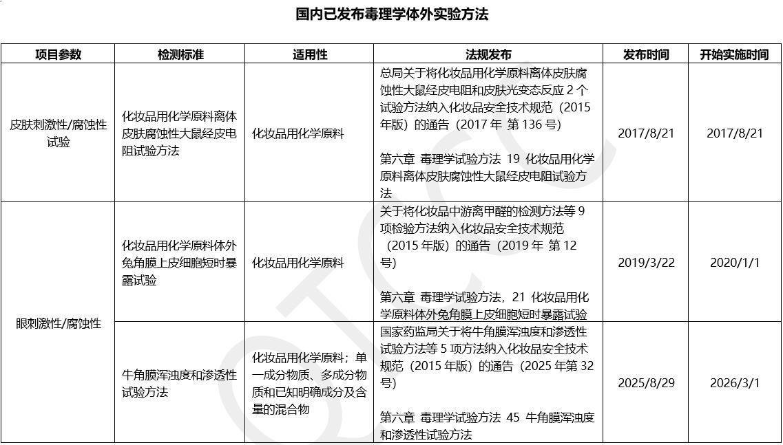 · 眼刺激性:如体外兔角膜上皮细胞短时暴露试验(2019年)、牛角膜浑浊度和渗透性试验(2025年纳入,2026年实施)